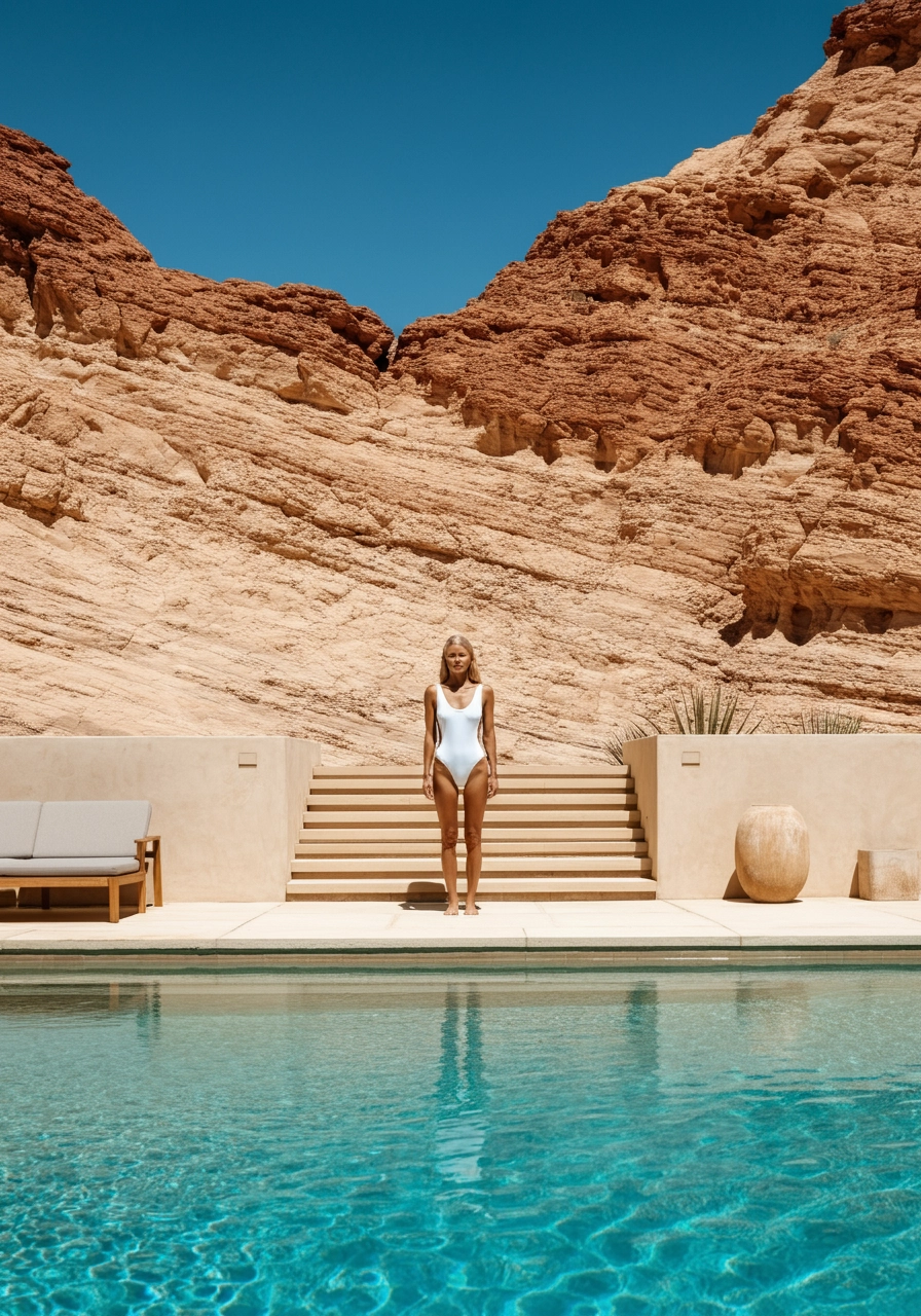 A warm scenic outdoor image favoring Amangiri resort featuring a female model standing confidently in a white one-piece swimsuit in the center of the composition. She is posed on light beige stone steps. Behind her is a rocky desert landscape with textured, beige stone cliffs under a vibrant blue sky, creating a dramatic backdrop. In the foreground, there is a swimming pool with clear water, reflecting rippling light patterns. The scene is brightly lit with natural sunlight, emphasizing the contrast between the smooth, modern pool area and the rugged, natural surroundings.