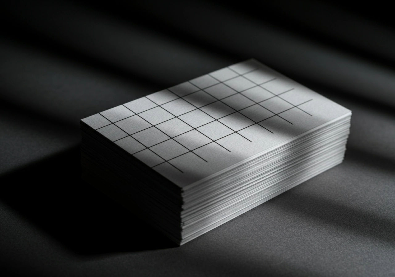 A stack of business cards sits against a dark background. The lighting is dramatic and angled, casting intricate shadows and highlighting the texture of the paper and grid. The background is a textured gray that complements the card design. The composition is a close-up with a focus on the typography and details of the material, creating a sophisticated and professional atmosphere.