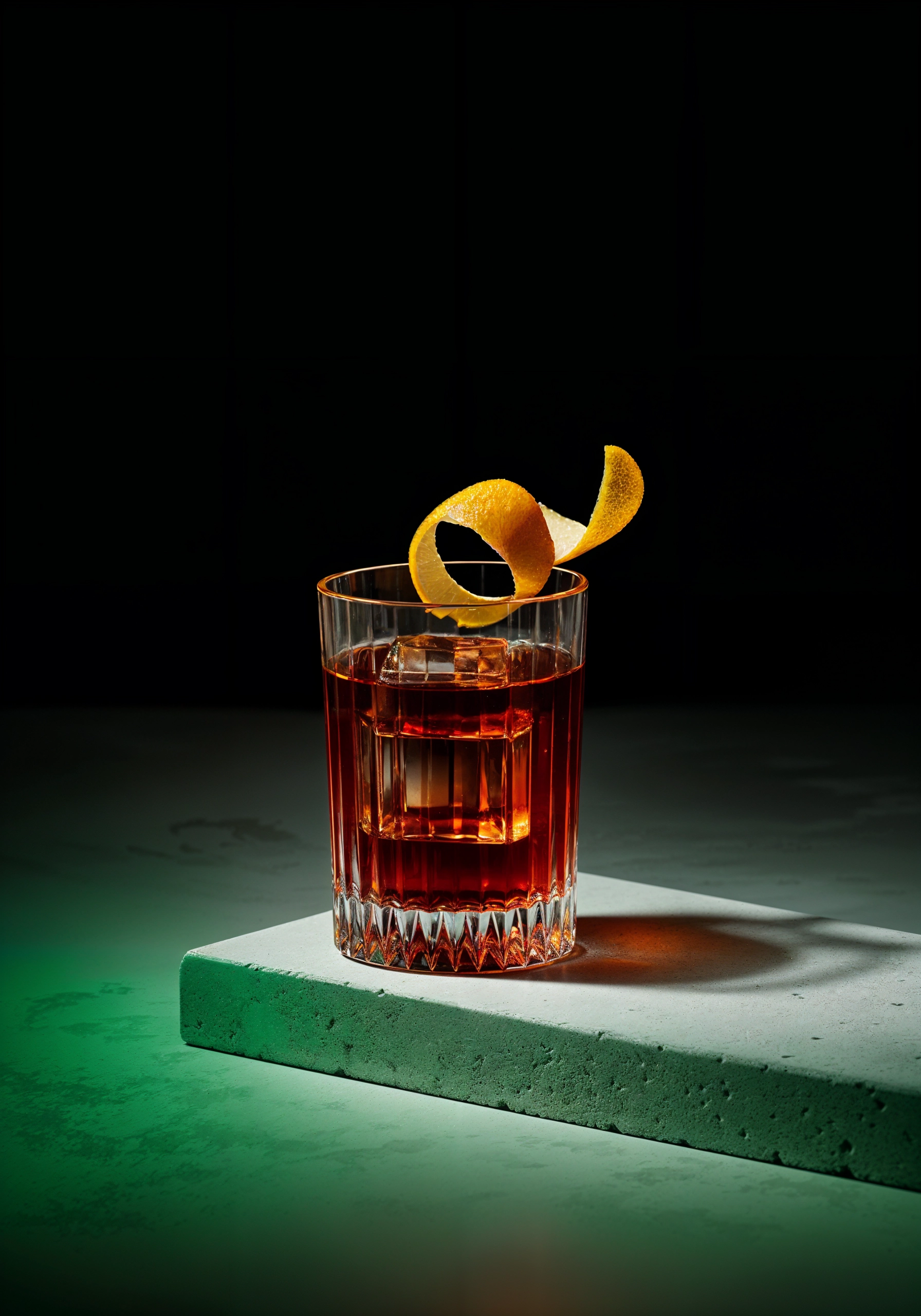 A minimalist cocktail styled to reflect the essence of brutalist design: a Negroni served in a matte, geometric glass with sharp, clean lines. The drink features a rich amber color, highlighted by a sculptural citrus peel garnish that twists dramatically above the rim. The setting includes a textured concrete surface and subtle green lighting, adding depth and contrast to the bold simplicity of the presentation. The overall mood is modern, architectural, and refined.