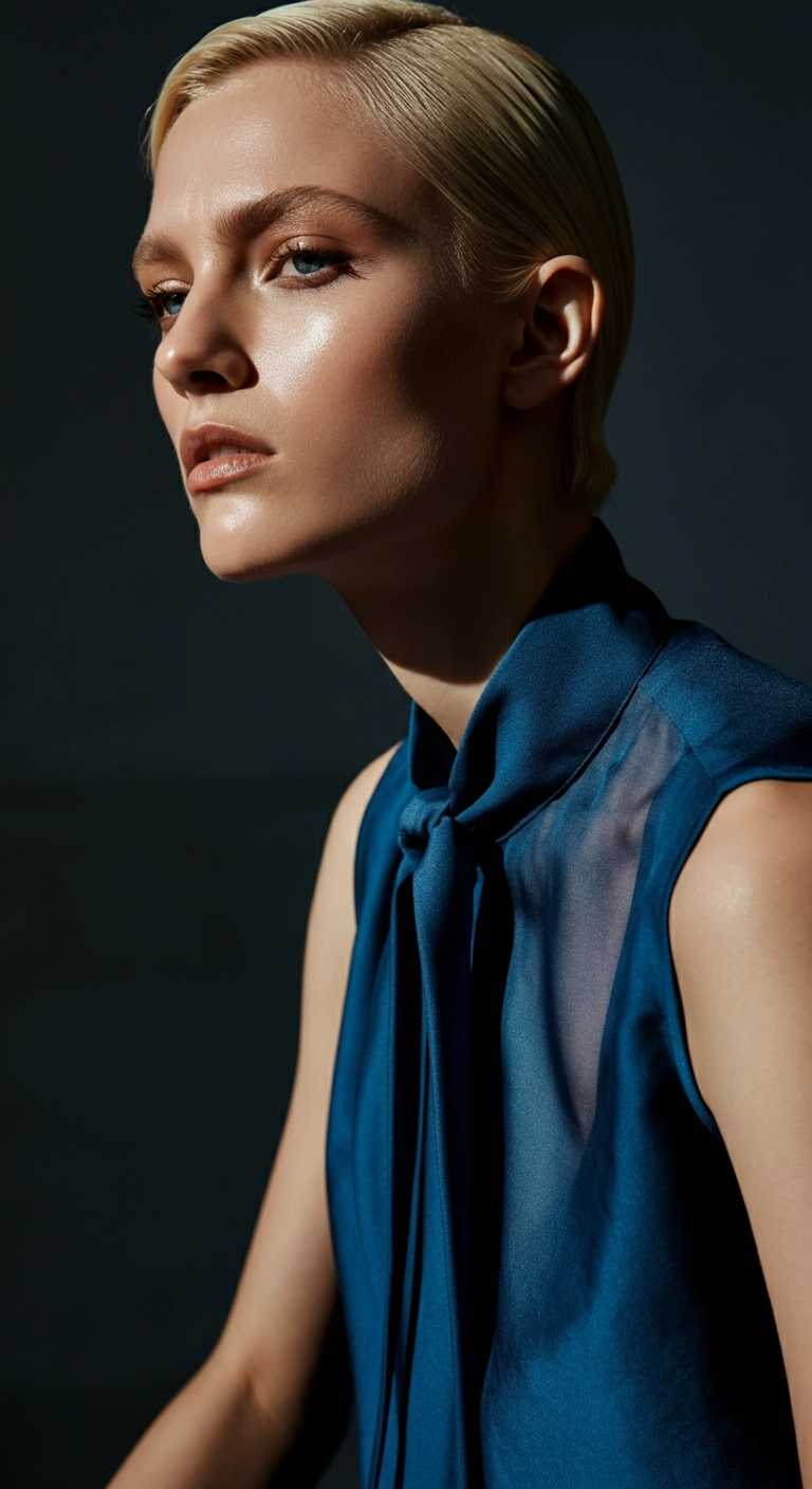 fashion editorial photo, blonde woman with short hair, blue strappy blouse, subtle necklace. The woman is sitting sideways looking at the camera, she's in a photography studio with the light coming from the window. photo captured with a sony alpha 7R IV 50 mm lens. Extreme close-up, the skin has a realistic texture