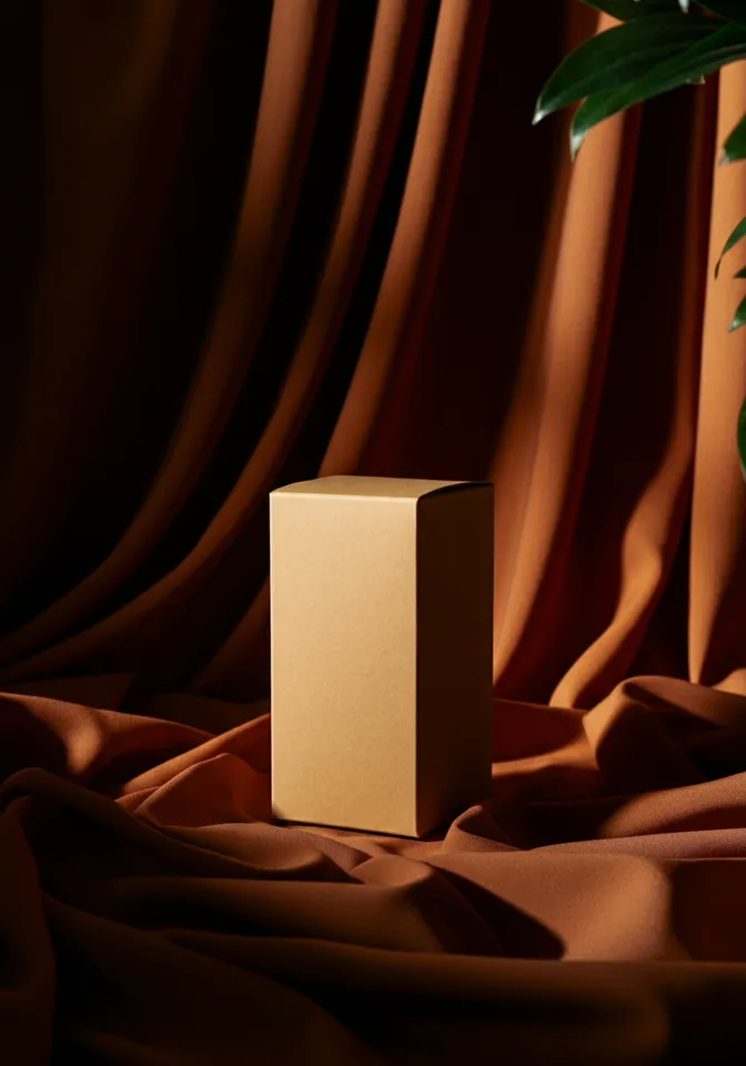 Studio photoThe lighting is soft and diffused, creating subtle shadows on the pleated curtain and product. Clean, editorial look with a focus on packaging form and contrast in background. and a bit of plants