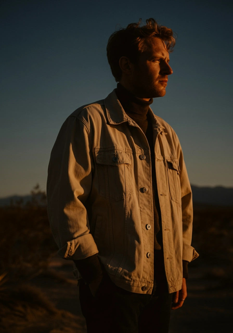 studio photo of white man silhouette wearing a beige jacket t in the desert sunset with vivid colors and shadows