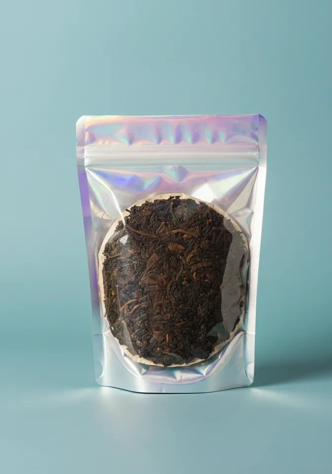A holographic tea package stands on the surface same as the background color - A soft pastel lavender with a hint of light blue, creating a calm and serene vibe. The packaging features a transparent plastic material in the front, behind which shu puer tea is put. No logo on the package. The background creates depth and perspective. The lighting is lice in a studio, highlighting the iridescent colors of the package.