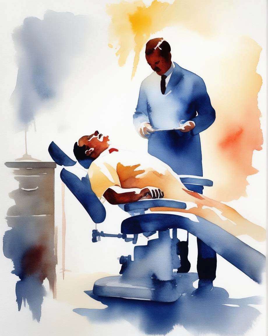 painting of dentist silhouetted on white background, done in the style from the impressionist era