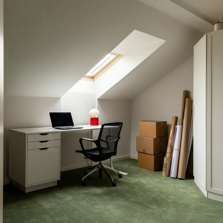 A mid century modern office room with a slanted ceiling, featuring a white desk with a closed laptop and a small red item on top. An empty black mesh chair is positioned behind the desk. A stack of cardboard boxes and rolled papers is neatly arranged in the corner, beside a plain white closet. The room is dimly lit by natural light from an overhead window, casting a soft glow on the green carpet, creating a stylish and functional atmosphere. The perspective is from the doorway, revealing a compact, organized workspace with mid century modern design elements.