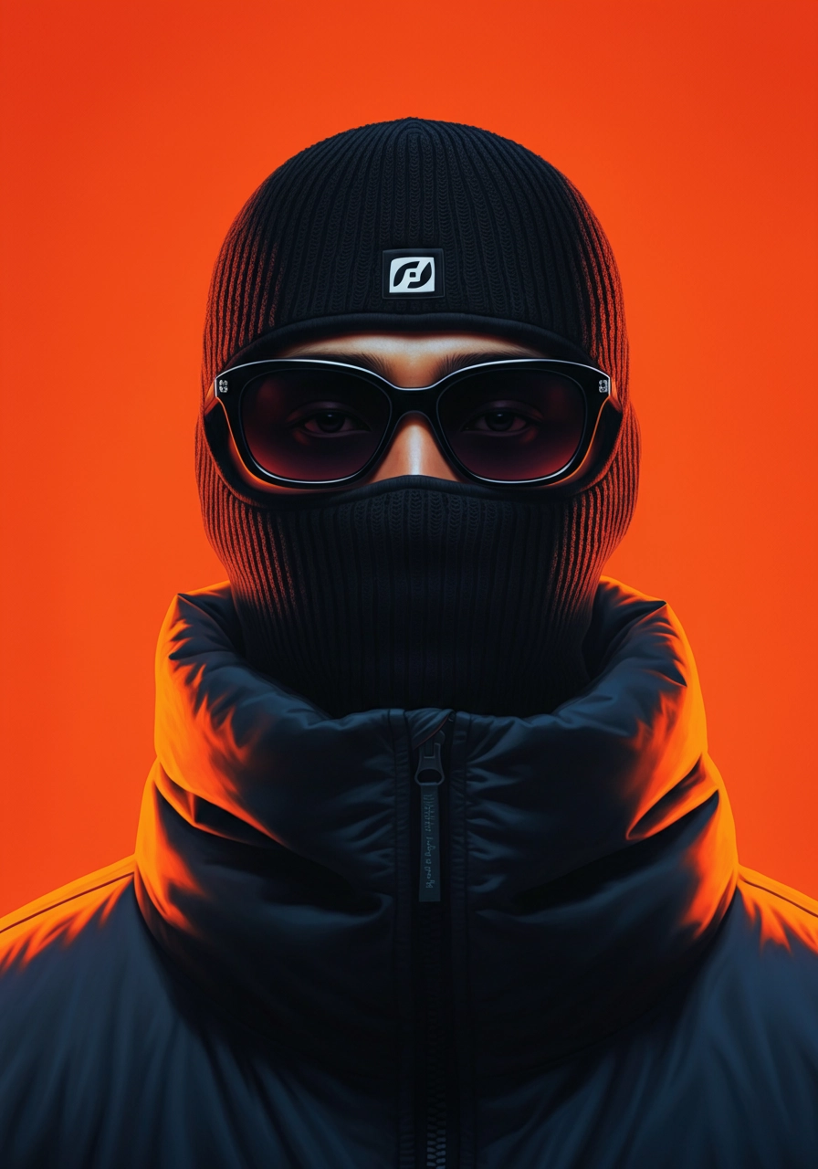 Design a close-up portrait of a person against a vibrant, solid orange background that creates a bold contrast with their attire. The subject is a person of ambiguous ethnicity, wearing a sleek, black knitted balaclava that covers their head and neck, leaving only their eyes visible. The balaclava features a distinctive white logo on the front, adding a modern and sporty touch. Their eyes are shielded by oversized, dark sunglasses with a reflective finish, without any text on the glasses. This detail adds an element of intrigue and style, making the eyes appear mysterious. The subject's attire includes a high-collared jacket with a smooth collar without fluff, softening the overall look and providing a textural contrast to the sleek balaclava. The lighting is bright and even, highlighting the textures of the fabrics while casting subtle shadows that enhance the facial features. The composition should convey a sense of modern streetwear aesthetics, blending elements of fashion and sport, while the bold color palette evokes energy and confidence. The overall vibe is contemporary and edgy, appealing to a youthful audience.