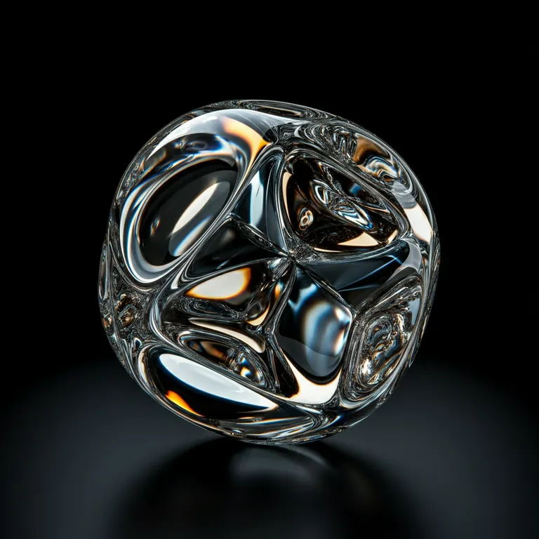 Illustration of a 3D rendering of a glass irregulalr spherical, its form capturing and magnifying light to display a kaleidoscope of striking colors. Positioned against a deep black backdrop, the shape's edges gleam, and the colors within it pulse with vibrant energy.
