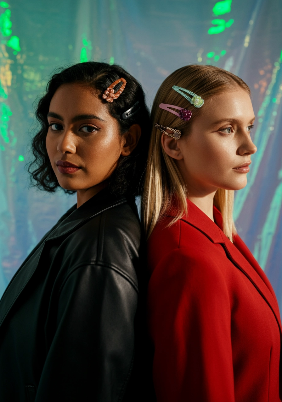 A woman facing away from another, one Latina and the other blonde, both wearing jackets—one black and the other red. The photo focuses on the hair clips in their hair, set against a shiny environment with iridescent elements.