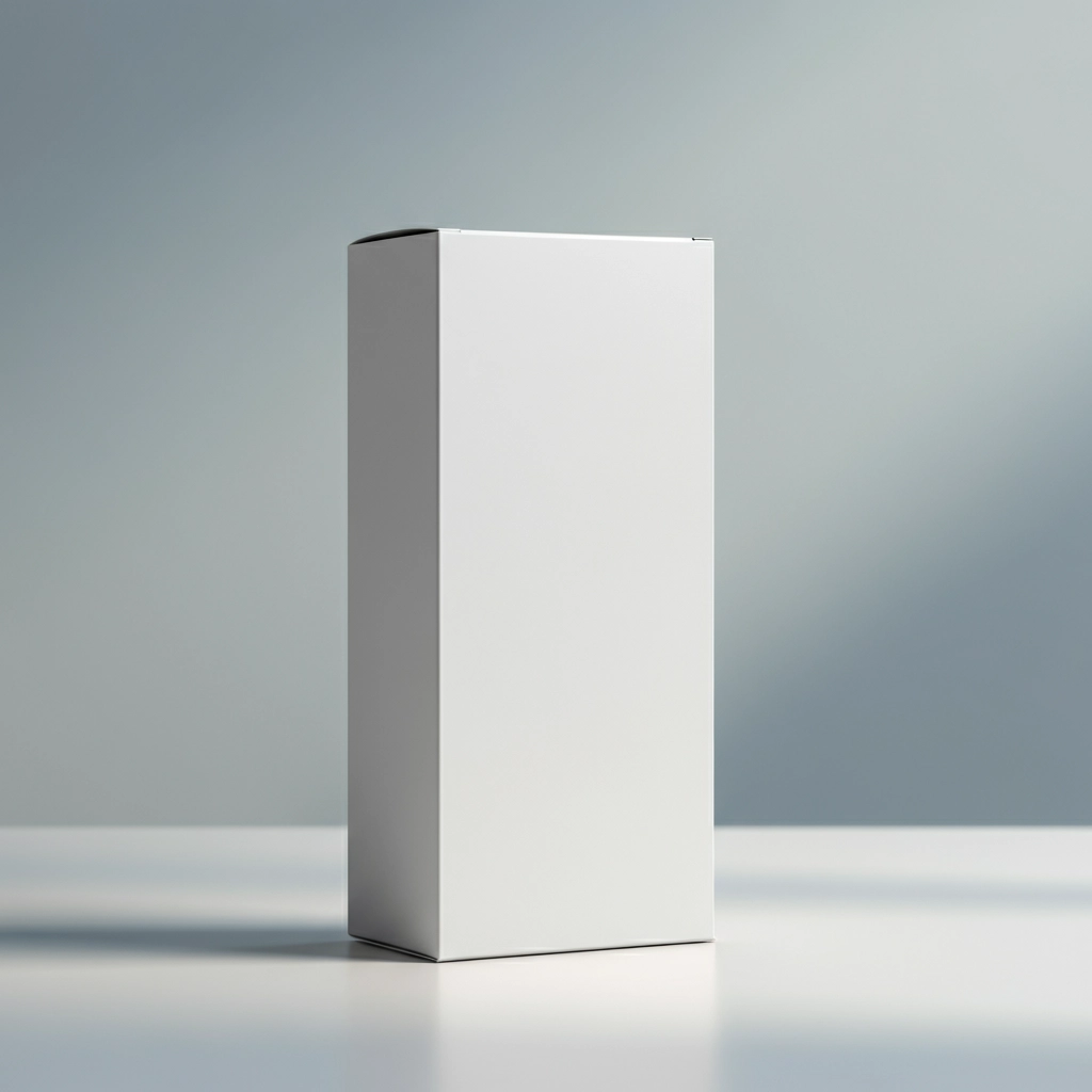 create a realistic mockup white box standing on white table. the light is cold and lies smoothly