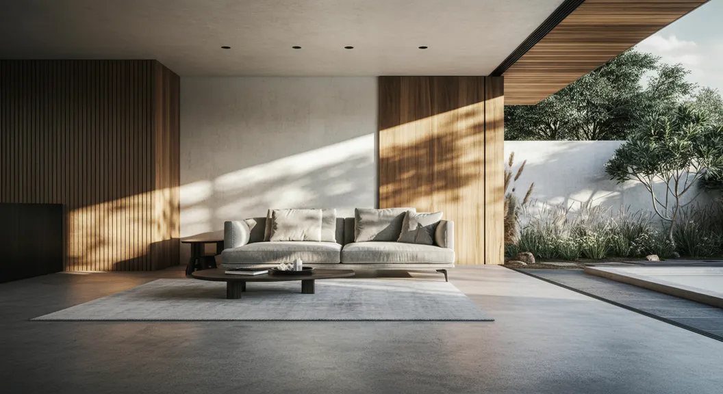 A close shot of the inside of a better minimalist, modern living room in a luxurious house. The view focuses more on the interior with polished concrete floors and wooden elements, contemporary furnishings against clean, off-white walls, softly illuminated by natural daylight. Shadows from nearby trees pattern the walls, enhancing the serene ambiance, while a large floor-to-ceiling glass sliding door can also be seen. The bright yet gentle light suggests late afternoon, capturing a harmonious blend of nature and sophisticated architecture, evoking a tranquil and inviting mood.