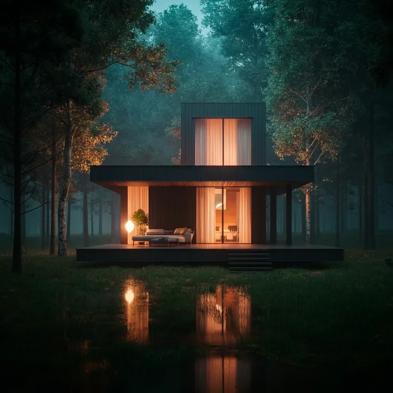 Minimalist modern cabin with a flat, rectangular shape, surrounded by woods and open grassy fields