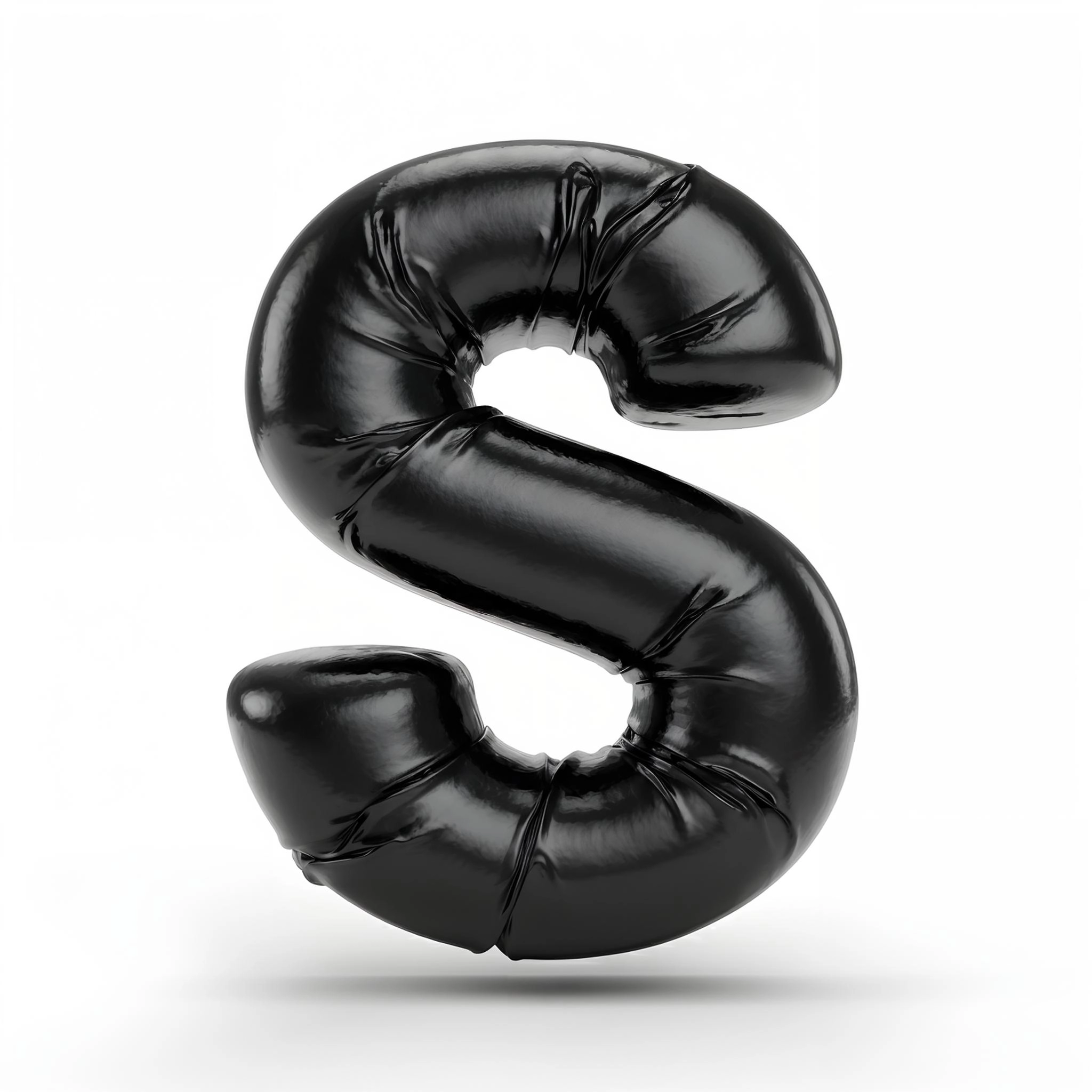 The letter 'S' crafted from black polyethylene plastic, set against a plain white background. The material has a glossy, crinkled texture, with folds and wrinkles adding depth to the shape of the letter, creating a bold contrast with the clean, minimal white backdrop.