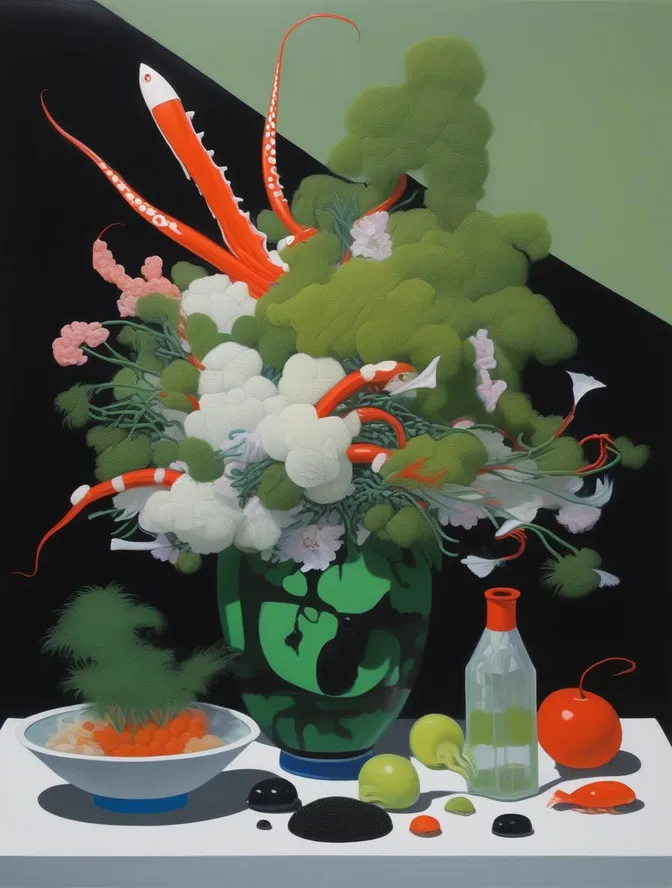 Japanese ikebana algae bouquet with squid and seaweeds and plastic bags and caviar and cherry blossoms and shellfish and beluga wales classic dutch master portrait still life oil painting high details
