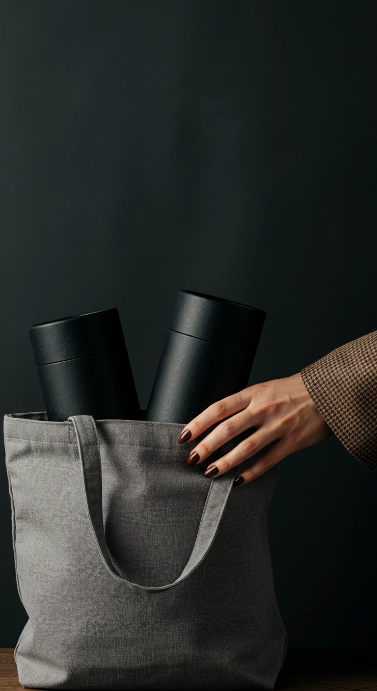 2 cylindrical paper tube containers in a matte black finish, 19 x 19cm, coming out of a grey tote bag. A white hand with dark brown almond-shaped nails in brown couture blazer sleeves, picking up one of the coffee bags, background is dark