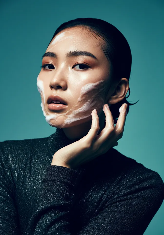 east asian woman face with foam on face