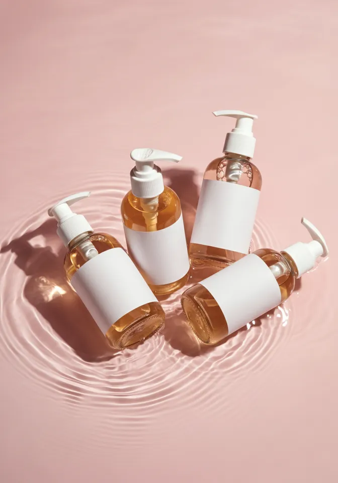 High-angle photo of 3 glass cosmetic pump bottles with blank labels, filled with liquid. The bottles are placed on a soft, rippling water surface, with light reflections creating wavy patterns around them. Soft, diffused overhead lighting highlights the color of the liquid and adds a clean, minimalist aesthetic. Background in light pink tones to enhance the relaxing and luxurious feel