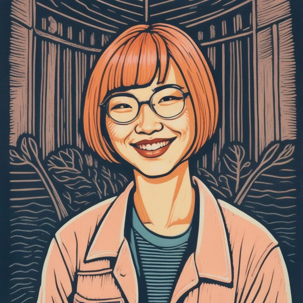 a headshot of a smiling female UX designer with an oval face, vietnamese features, and peach-colored bob-cut hair with bangs, in a cyberpunk shirt