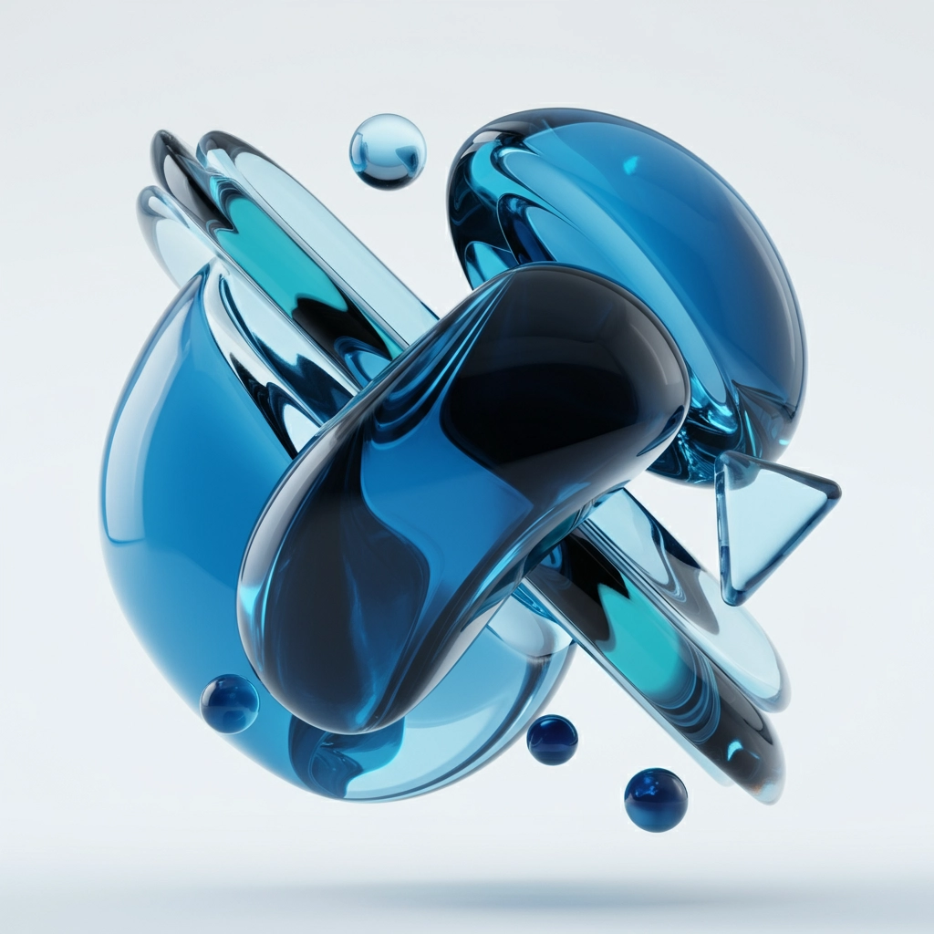 Create a minimalistic composition with a pure white background. Include translucent, glass-like geometric shapes—circles, semi-circles, and triangles—with harder, sharper edges rather than soft beveling. The shapes should appear to float in space, with no visible surface beneath them. Use a deep blue color palette as the dominant tone, with minimal use of complementary iridescent colors, ensuring that the blues remain prominent. Incorporate a slight sense of depth through inner highlights and glowing light effects along the sharper edges, while keeping the background fully transparent. Ensure a clean, futuristic, and ethereal aesthetic.