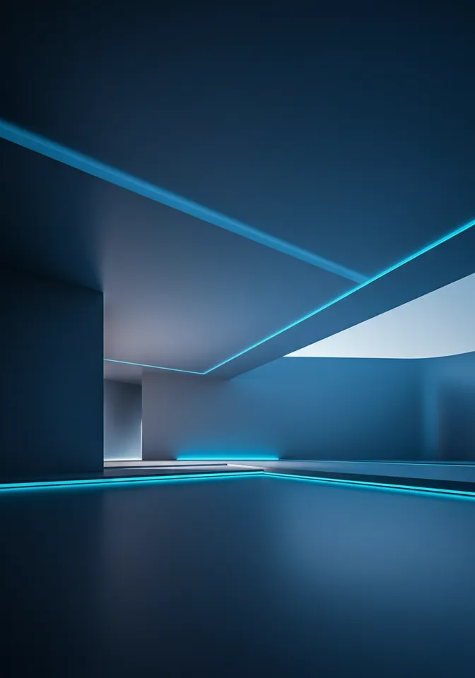 Minimalist realism photography of a modern architectural structure with clean geometric lines, shot from a low angle to emphasize grandeur, using a Sony Alpha 7R IV camera and wide-angle lens. The environment features a simulated dark blue-toned backdrop under soft natural light, leading lines composition guiding the perspective, with vibrant blue hues creating mystique and contrast.