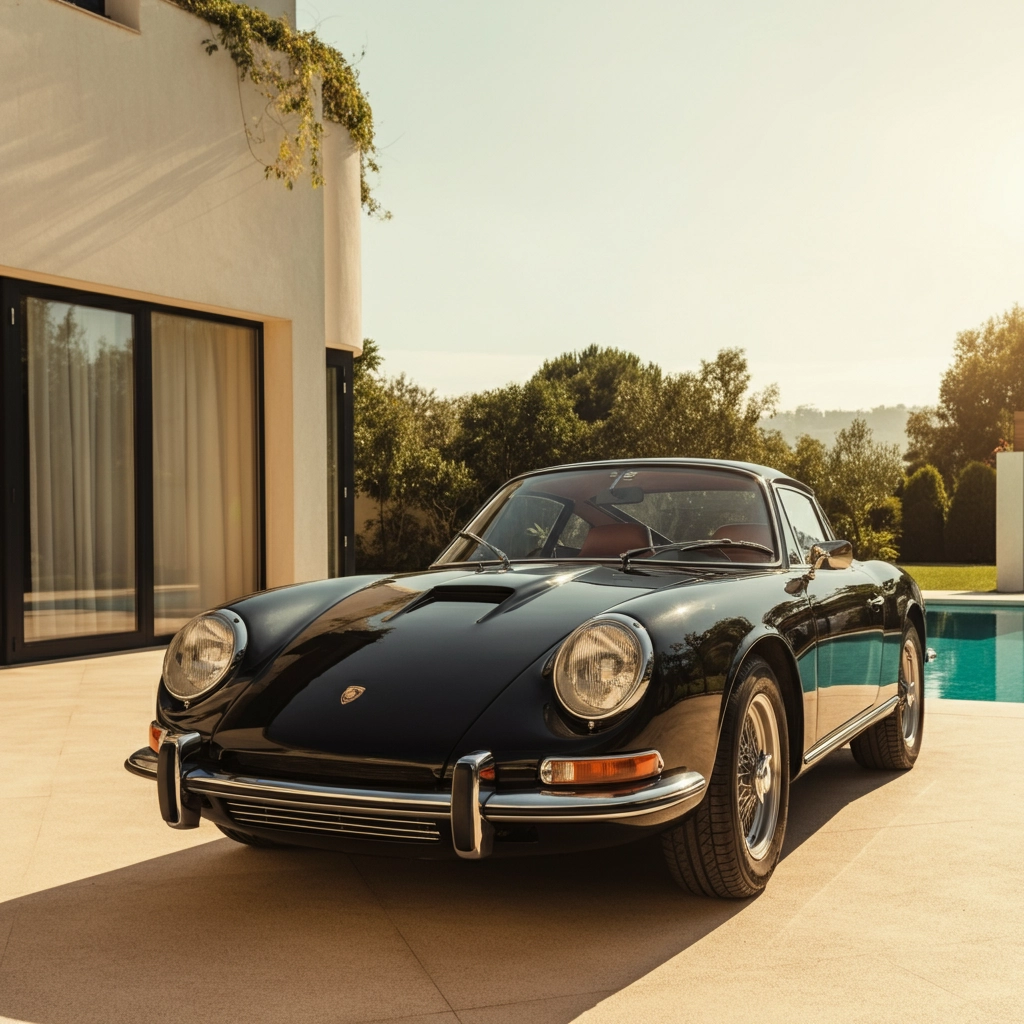 black porshe in professional shooting for advertising, with retouch and color grading. Car parked in a luxury house, besides a big pool. Warm color grading, Sunlight casts warm tones across the scene, creating a cheerful and inviting atmosphere.
