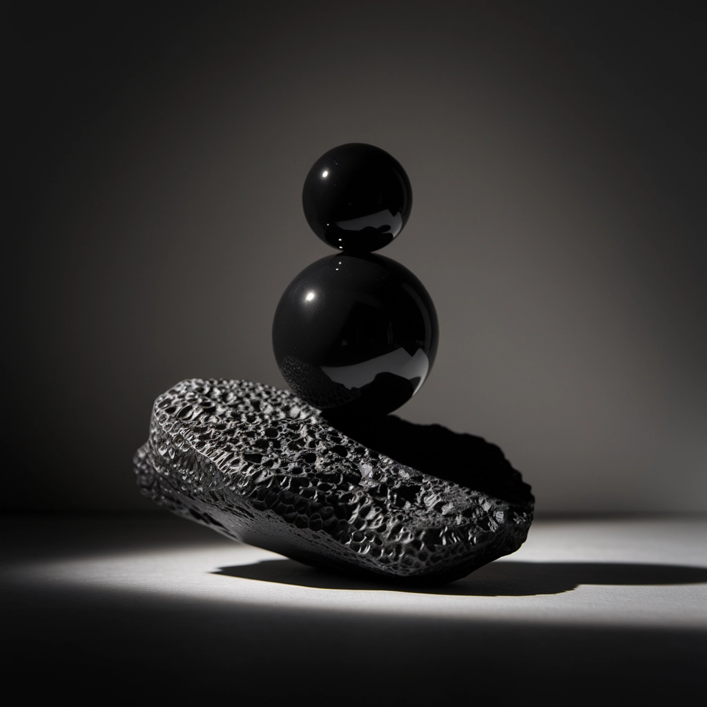 A conceptual still life featuring organic and synthetic elements in a striking interplay of form and texture. A perfectly smooth, reflective black sphere is delicately balanced atop a jagged, porous volcanic rock, creating a dynamic contrast of surfaces. The background is a deep matte gray, subtly fading into darkness. Soft, moody lighting casts elongated shadows, emphasizing the juxtaposition of rough and polished materials. The overall composition is minimalist yet evocative, evoking a sense of tension, harmony, and contemporary design sensibilities