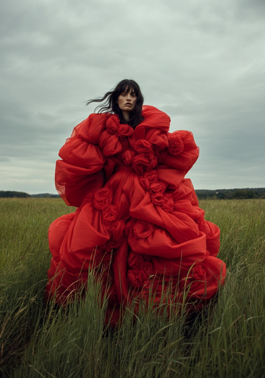 A surreal and captivating portrait of a woman standing in a vast field of tall, green grass under an overcast sky. She wears an extravagant, couture gown adorned with voluminous ruffles and oversized red floral details that create a dramatic and organic texture. The dress flows around her, giving her an ethereal and almost otherworldly presence. Her dark, shoulder-length hair flows gently in the wind, adding movement and a sense of connection to nature. Her expression is calm and poised, exuding strength and serenity. The composition emphasizes the contrast between the vivid red flowers on her gown and the soft, muted tones of the natural environment, creating a visually striking and harmonious scene. The atmosphere is dreamlike and elegant, blending fashion with the raw beauty of nature.