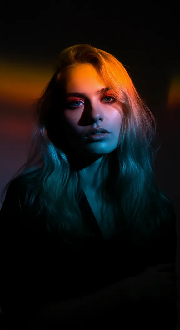 Крупный план. красивая девушка с белыми прямыми волосами , с неоновыми лампами синего и красного цвета