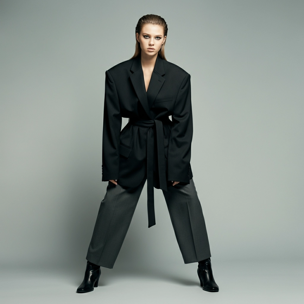 A young model posing in front of a minimalist gray background. She is wearing an oversized black blazer, cinched at the waist with a thin belt, paired with tailored trousers and sleek leather heeled boots. Her hair is styled back into a low, elegant bun, highlighting her striking facial features. Her expression is serious, with an intense gaze directed at the camera, and her makeup is subtle, focusing on precise eyeliner and nude lips. The soft lighting creates delicate shadows, accentuating the contours of her face and the impeccable cut of her outfit.
