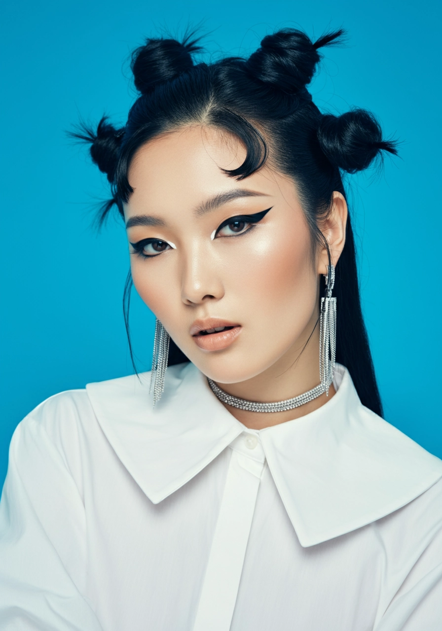 a high-fashion studio portrait of a young asian woman with sleek, jet-black hair styled in a segmented ponytail, each section carefully tied to create a bubble-like effect. Her makeup is minimal but striking, with sharp winged eyeliner that accentuates her almond-shaped eyes. She is wearing a crisp white blouse with a wide collar, complemented by delicate silver jewelry, including a choker and multiple earrings. The model is striking a confident pose, tilting her head slightly to the side while looking directly into the camera with an intense gaze. Her lips are slightly parted, adding a sense of intrigue and allure to the image. The background is a vibrant blue, making the subject's features stand out dramatically. The lighting is soft and even, highlighting her flawless skin and the texture of her hair. Use a medium-format camera with an 85mm lens for a sharp, high-resolution image that captures every detail.