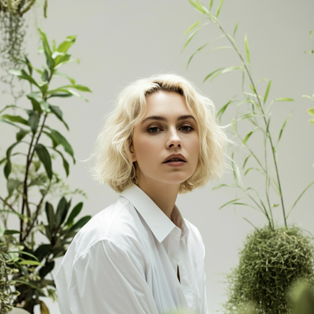 Blonde woman with short hair posing in nature, wearing a white shirt, surrounded by plants