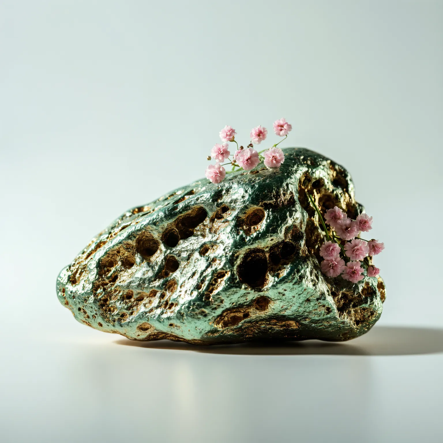 a metalic, organic, highly detailed rock on a white background with small flowers blossoming