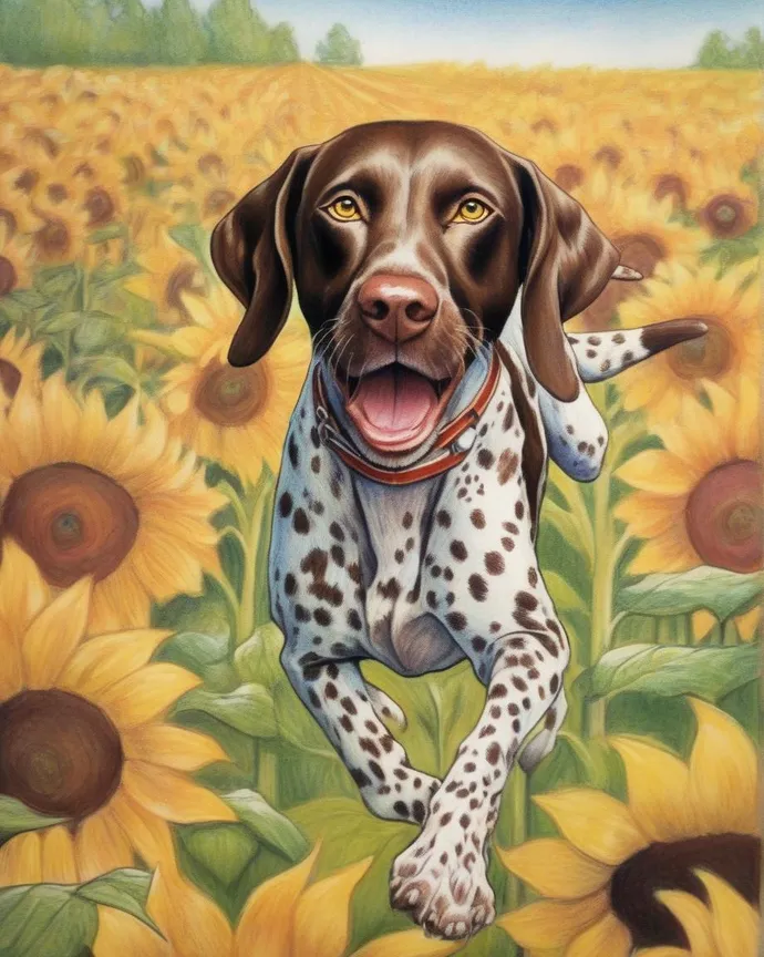 a german shorthaired pointer running in a field surrounded by sunflowers