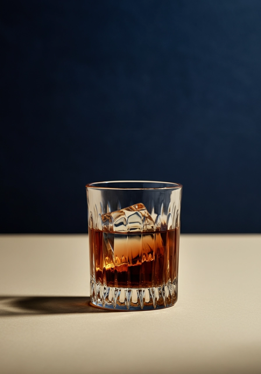 a short glass with a negrony in it. The glass is on a beige subtly textured surface. The background is navy blue.