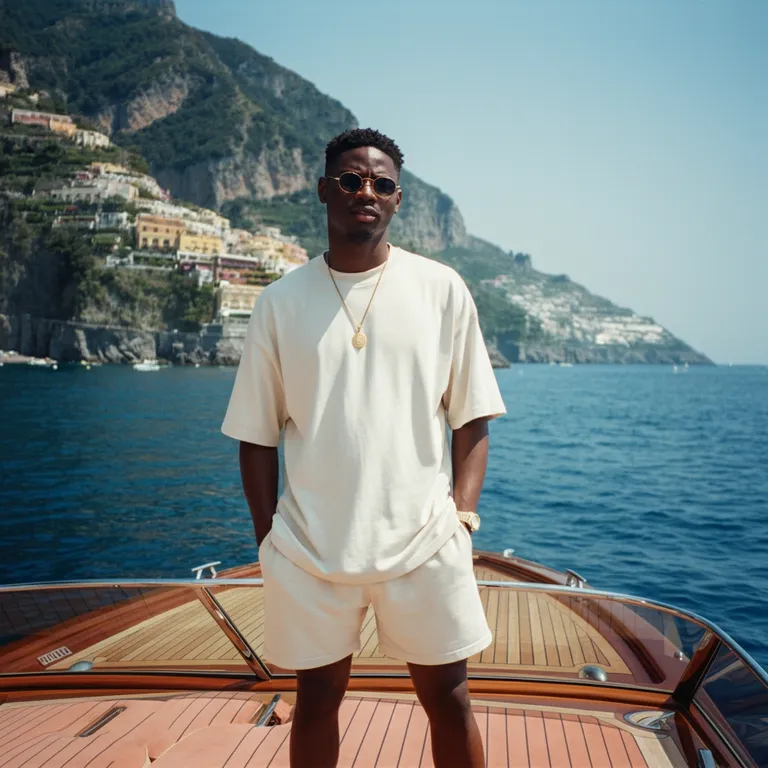 A good looking black male standing on a luxury speed boat with the Italian coast behind him. He is dressed in a plain white oversized tee shirt and sweat-shorts in a casual state. Sunglasses on. Hands in pocket. Confident but relaxed. Shot on Portra 400 with a Leica film camera