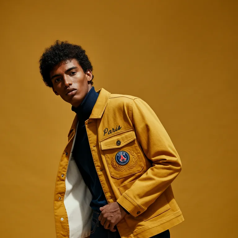 A fashion-forward shot featuring a male model wearing a mustard yellow button-up jacket with a large patch pocket on the chest. The jacket is part of the PSG (Paris Saint-Germain) collection, with 'Paris' elegantly embroidered on the left chest and the club's logo subtly embossed on the pocket.