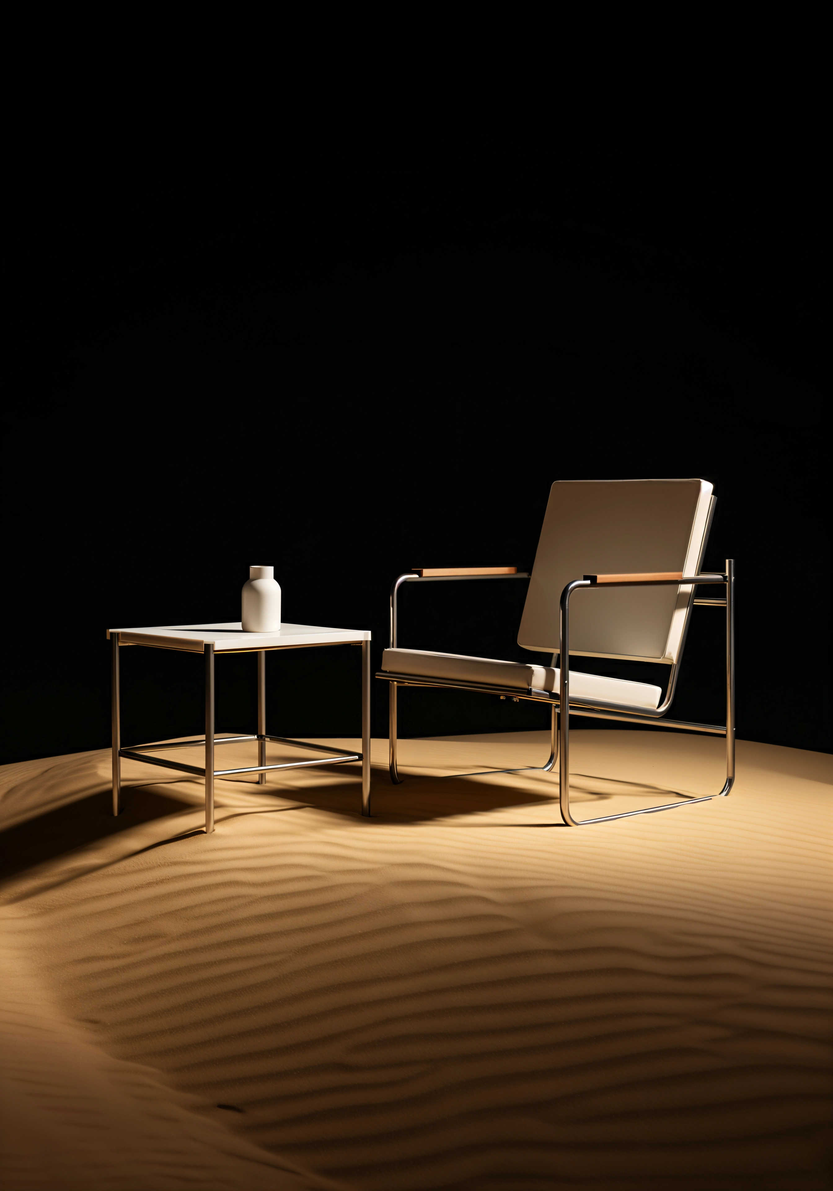 (Bauhaus-inspired furniture)) in sand dunes, dramatic shadows at high noon, minimalist composition with single red neon accent, focus on clean lines