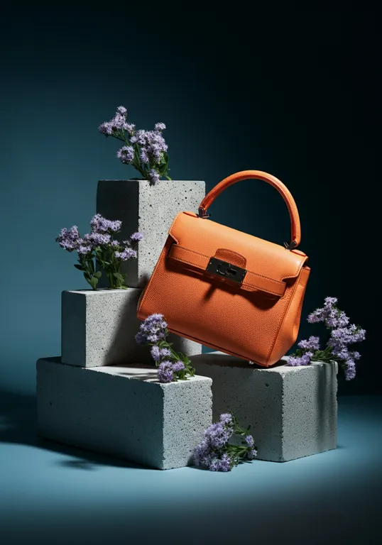 Light orange leather handbag, (detailed stitching:1.2), (smooth leather texture:1.2), placed on a tiered display of light gray blocks, (rough concrete texture:1.1), with small, delicate, light purple flowers growing amongst the blocks, (detailed flower petals:1.2), (flower arrangement:1.2), against a deep blue backdrop, photorealistic style, product still life, display of a luxury handbag, central focus on the item in the image, bag is positioned diagonally, angled view, soft lighting, natural shadow cast by the handbag, focused on the detail of the leather and the styling, contemporary fashion still life, composed, high detail, 8k resolution.