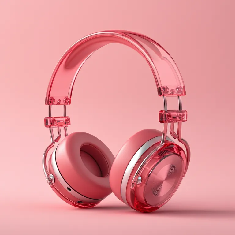 “Elegant, futuristic pink absolutely transparent glass 3D headphones on a slight pink background
