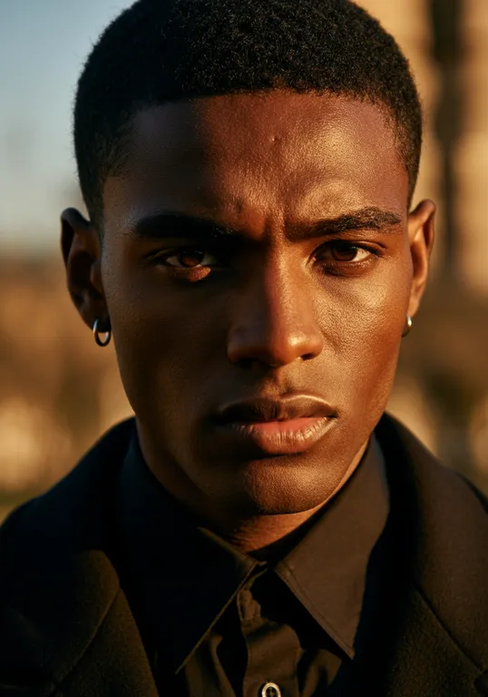 A striking portrait of a male model during golden hour, exuding a sense of calm confidence and elegance, perfectly aligned with Zara’s understated and sophisticated aesthetic. The model is captured in a close-up shot, with the focus on his face, which is framed by soft, out-of-focus elements in the foreground, adding depth and a dreamy quality to the image. The model’s expression is serious yet contemplative, with a direct gaze that engages the viewer. His skin, beautifully lit by the warm, golden light, shows a rich texture, with subtle highlights and shadows enhancing the contours of his face. He has short, textured hair, neatly styled, and wears a simple, clean-cut shirt with a sharp collar, buttoned up for a polished look. A small hoop earring in one ear adds a touch of modernity and edge to his otherwise classic appearance. The background is soft and blurred, ensuring that all attention is on the model's face and the details of his expression. The golden hour light emphasizes the play of light and shadow, creating a timeless and sophisticated mood. The overall composition is minimalist and elegant, with a focus on the model’s natural features and the subtle details of the clothing, capturing the essence of Zara’s modern, refined style.