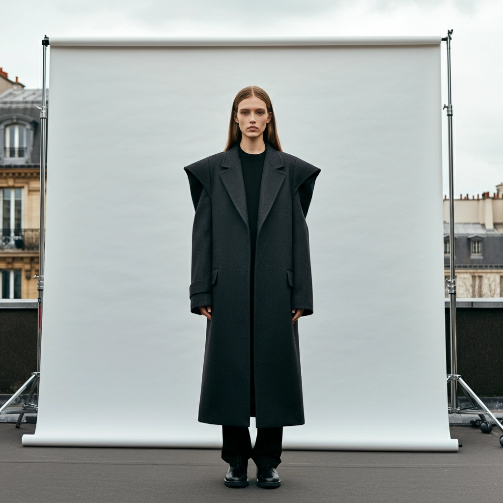 A fashion model stands confidently on a city street, wearing a long, elegant, dark coat with exaggerated shoulders. Her long hair falls loosely, and she maintains a serene expression. The scene is set against a stark white backdrop held up by stands, contrasting paris central she's in rooftop in paris. the composition emphasizes the striking contrast between the subject and the environment, creating a bold, avant-garde atmosphere. The centered, frontal perspective adds a sense of intensity and focus to the image. color