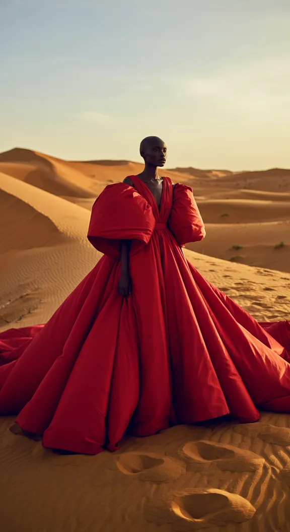 A dark-skinned, completely bald model stands in the middle of a vast desert of golden sand, creating a scene of striking contrast and power. Her gaze is fixed on the horizon, conveying a sense of strength and contemplation, as if she is connected to something beyond the endless landscape. She does not look at the camera but instead looks straight ahead, reinforcing her commanding presence in the vast, arid surroundings. She wears a vivid red gown, extremely voluminous and floor-length, made of flowing fabric that responds to the warm desert wind, creating dramatic and fluid movements. The layers of the dress spread around her, forming a vibrant splash of color that cuts through the golden monotony of the environment. The fabric subtly reflects the sunlight, adding an intense glow that enhances the grandeur of the scene. The setting is bathed in a rich, golden light, as if captured in the late afternoon when the sun kisses the horizon and envelops everything in a warm, ethereal glow. This light casts soft, elongated shadows on the sand, highlighting the dunes and adding depth to the scene. The golden hue blends seamlessly with the reflections on the dress, creating a harmonious fusion between the model and the landscape. The image is shot from a slightly high angle, emphasizing the model at the center of the composition. This perspective makes her appear both small in the vastness of the desert and incredibly striking, serving as the hypnotic focal point of the landscape. The sky above is a soft blue, beginning to be tinged with warm tones, signaling the imminent sunset. The wind lifts small grains of sand in the background, adding texture to the scene without obscuring the sharp details of the dress and the model’s figure. Her posture is upright and elegant, as if she is a powerful entity within the endless expanse. The combination of the vibrant gown, the golden light, and the desert setting creates a highly realistic, editorial-style fashion image, playing with contrasts of color, texture, and light to produce a visually captivating and unforgettable composition.