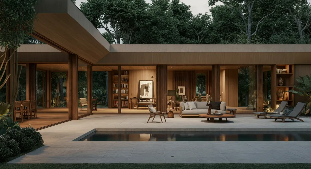 Una moderna casa de diseño minimalista con estructura de madera y vidrio, ubicada en un entorno natural rodeado de árboles y vegetación exuberante. El interior es amplio y luminoso, con grandes ventanales que permiten la entrada de luz natural y ofrecen vistas panorámicas al paisaje exterior. El espacio cuenta con una decoración cálida y elegante en tonos neutros y terrosos. En el área de estar, hay un sofá de diseño contemporáneo con cojines suaves, una mesa de centro redonda de madera con bandejas de té y objetos decorativos. El suelo es de piedra pulida que refleja la luz natural, y una alfombra en tonos claros aporta calidez al ambiente. Unas lámparas colgantes de mimbre iluminan el espacio con una luz tenue. En el fondo, se observa un comedor con sillas de madera y una biblioteca integrada en la pared con estantes llenos de libros. En el exterior, una piscina infinita con una plataforma de madera invita a la relajación, mientras unos sillones al aire libre ofrecen un espacio de descanso. El entorno natural es sereno, con árboles frondosos y césped bien cuidado. La iluminación cálida del atardecer resalta la belleza del paisaje y crea una atmósfera armoniosa y acogedora. La imagen tiene un estilo arquitectónico contemporáneo con una fuerte conexión con la naturaleza, inspirado en el diseño japonés y escandinavo