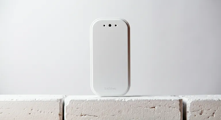 White kids mobile device with stout rectangular rounded corners, centered in the frame, is placed atop white brick against a silver white bright background. The scene is illuminated by soft studio lighting that casts gentle shadows and enhances the depth of color. There are no visible text or other elements inside the circular body of the product, which stands out prominently against its natural setting. This composition exudes simplicity, sophistication, minimalism, and a modern style.