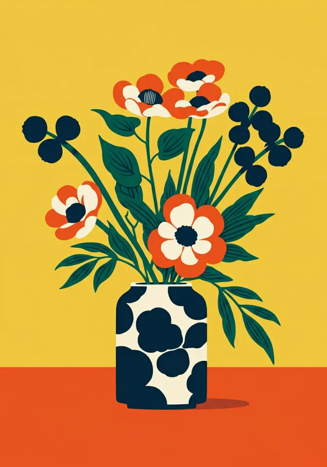 Japanese ikkebana arrangement in the style of Marimekko colorful pop art