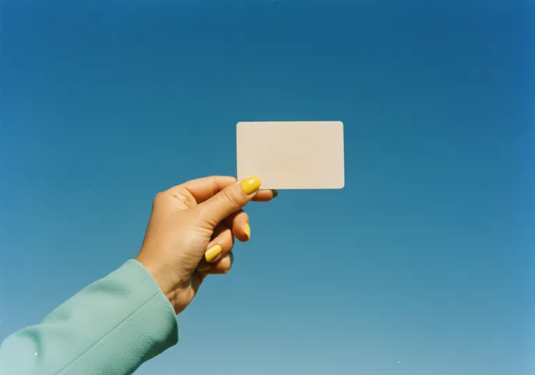 A close-up of a hand holding a blank credit card against a clear blue sky. The hand, with neatly manicured nails painted yellow, is prominently in the foreground, capturing the strong grip on the card. The card is blank. The hand is clad in a light mint sleeve. The lighting is bright and natural, with a the clear, minimalistic background. The perspective is straight on, focusing entirely on the hand and the credit card, conveying a sense of simplicity and clarity.