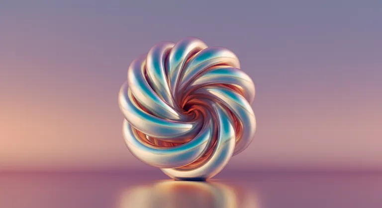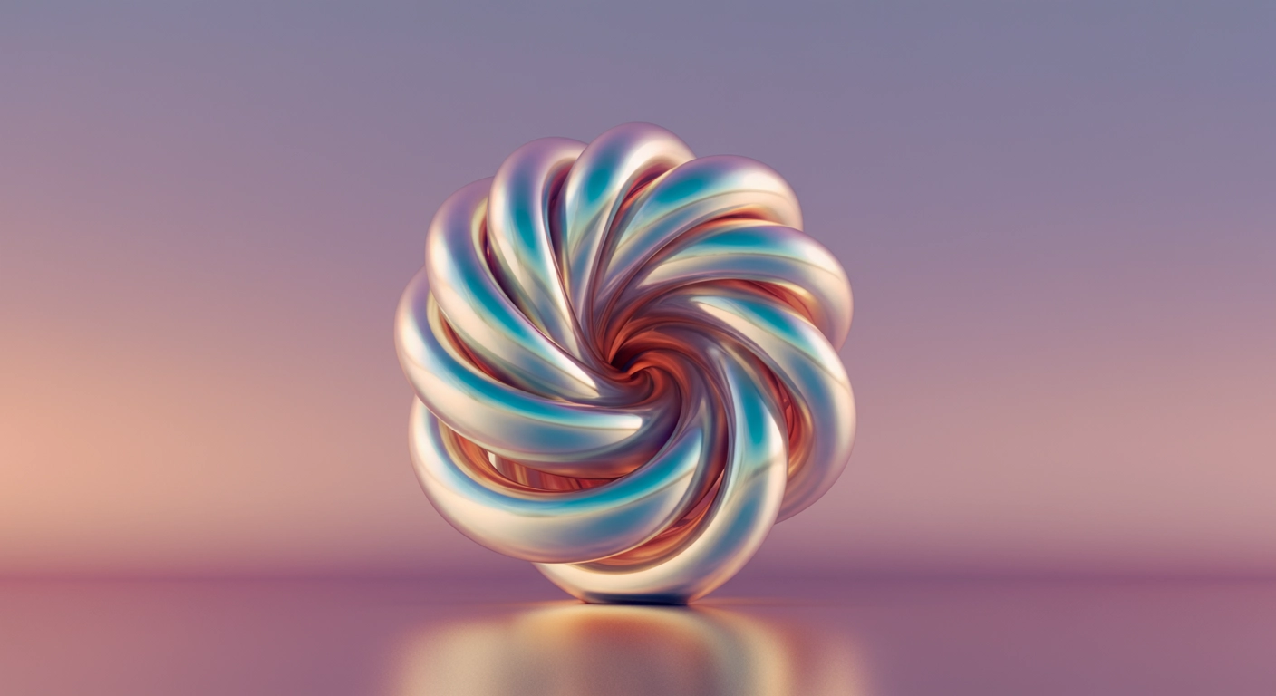 This image depicts a highly reflective, smooth, and metallic object resembling a spiral shape. The structure looks almost like a twisty straw blended with a flower with its surface reflecting a spectrum of colors—primarily blues, purples, greens, and oranges—creating a fluid, almost liquid appearance. The lighting in the scene gives the object a glossy finish, with highlights of bright white gleams across its curved surfaces, indicating the high reflectivity of the material. The background is softly colored, with a gradient from muted purple to peach, transitioning smoothly into a lighter tone at the bottom, which complements the reflected hues on the object. The interplay of light and color creates a dynamic scene, casting subtle multicolored reflections on the surface below the object, as well as surrounding it. The overall atmosphere is ethereal and futuristic, with the vibrant, almost iridescent look of the object suggesting a digital or computer-generated aesthetic.