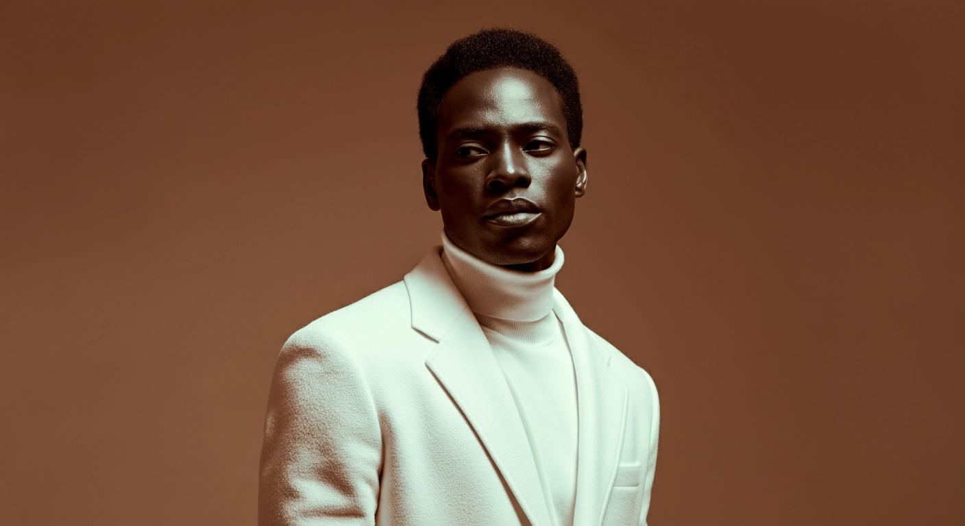Studio portrait of a Black Man standing shot on a Leica M-A with Lomography Redscale XR 50-200 in a 16:9 aspect ratio, visible only from the waist up, wearing a white minimalist outfit