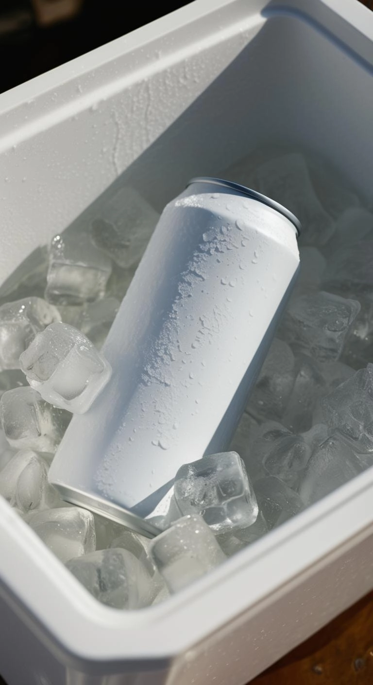 A close-up shot of a tall plain white can in a white cooler filled with ice, capturing a refreshing and laid-back vibe. The camera position is from the top. The lighting is natural and warm, creating highlights on the ice and adding a slight golden glow that enhances the coolness of the scene. The composition is relaxed and casual, emphasizing the textures of the ice and the aesthetic appeal of the can designs. The image conveys a sense of summer relaxation, and refreshment.