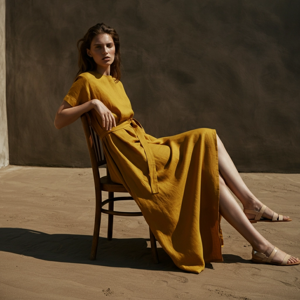 a model in a mustard-colored linen dress sits on a chair with a wooden back, the pose is relaxed, the chair is turned sideways. photo sunny