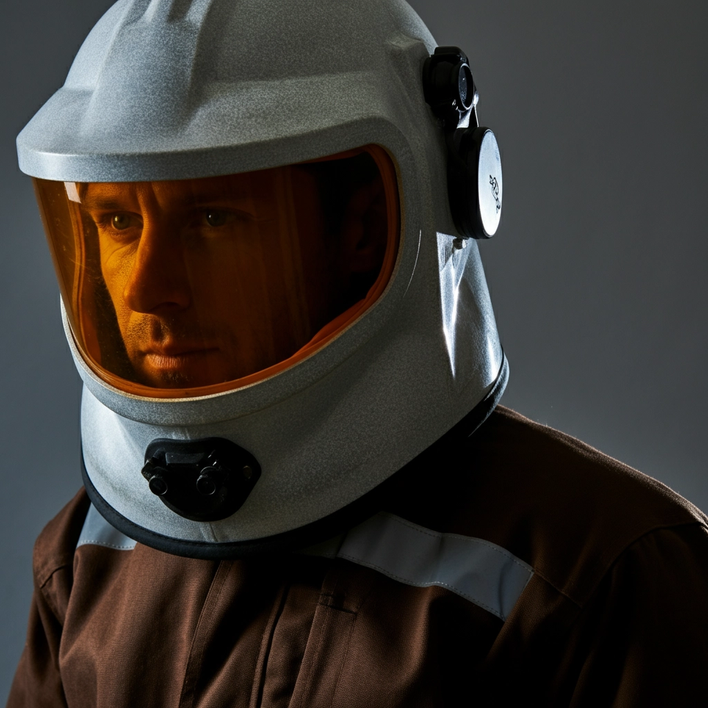 Close-up of protective clothing for an offshore oil platform. The background is a simple gray, creating a minimalist atmosphere. The clothing should be clearly visible in the foreground, capturing the strong grip of the jacket. he should be wearing a brown jacket. The lighting is bright and natural, with a light, minimalist background. The composition is well framed, focusing entirely on the model, evoking a sense of mystery and intensity.